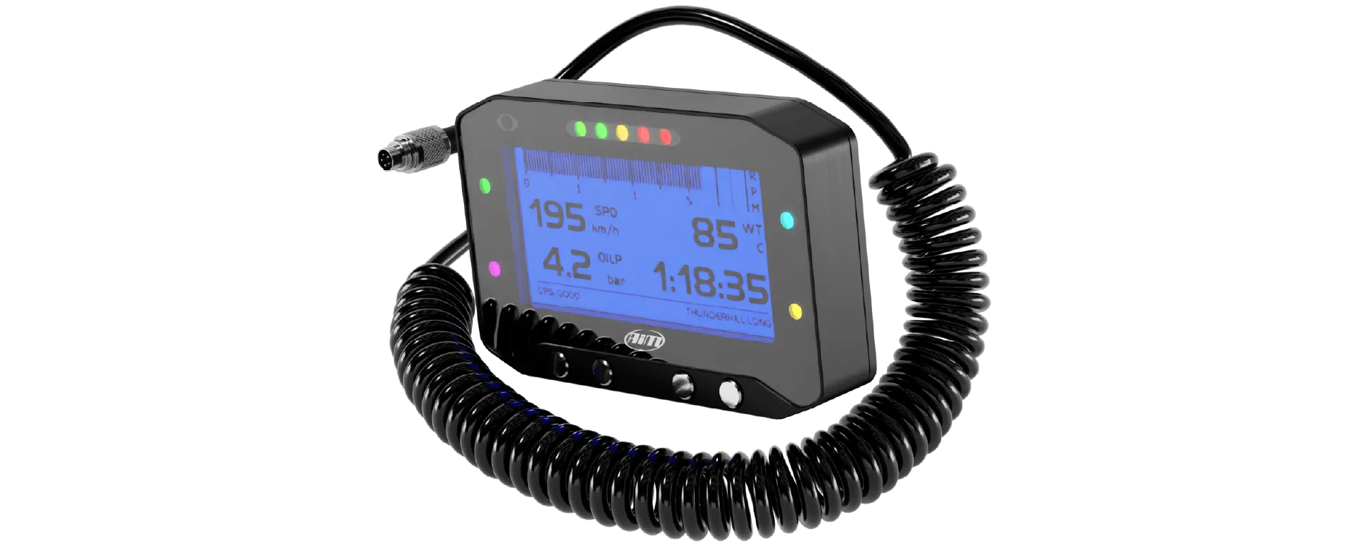 The Aim GS Dash is a compact display unit designed to work with the new generation Aim loggers, EVO4S and EVO5. It shows a variety of data gathered from your vehicle's ECU, GPS, sensors, and the inertial platform.
